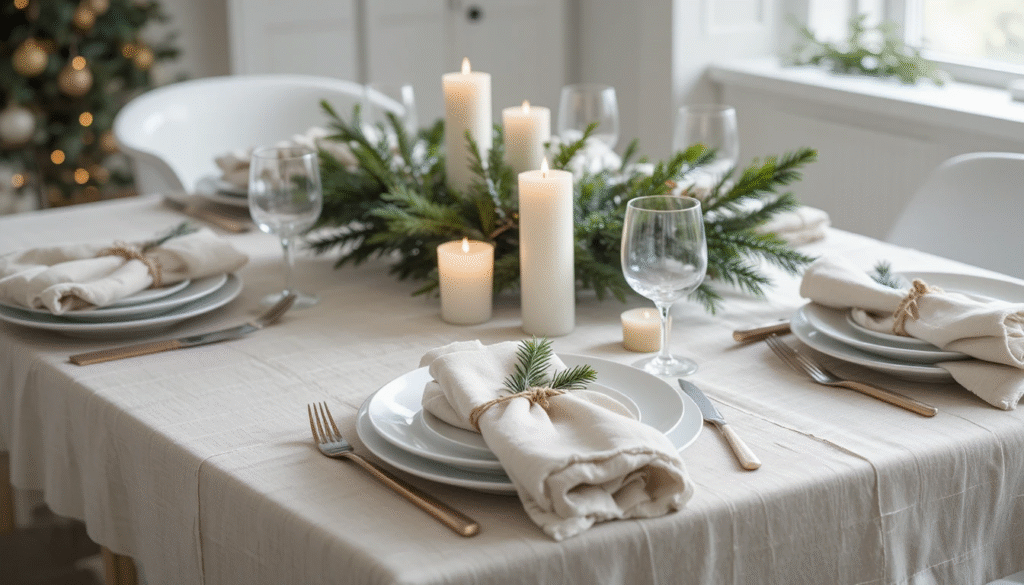 A Scandinavian Christmas table is all about understated elegance. Use a neutral linen tablecloth, white dishes, and natural centerpieces like evergreen branches or candles. You can tie napkins with twine and tuck in a small sprig of pine for a beautiful, natural look. Avoid overly ornate designs — simplicity is key. The result is a dining space that feels effortlessly stylish and ready for cozy gatherings with family and friends.
