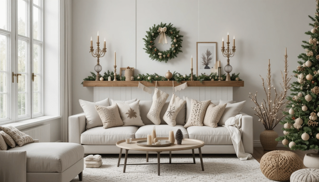 Scandinavian Christmas decor begins with a neutral color palette. Shades of white, beige, cream, soft gray, and muted brown form the foundation, creating a calm and airy backdrop. These tones help reflect natural light, especially during winter’s darker days, and make spaces feel open and inviting. You can add subtle contrast with black accents or natural textures like wood and linen to keep the look interesting without overwhelming the space.