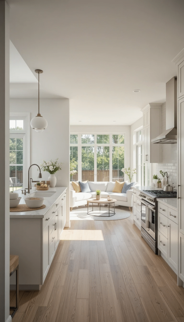 An open-concept layout also improves natural light flow, making the kitchen feel airy and welcoming. It works especially well in condos, townhomes, and modern suburban homes.