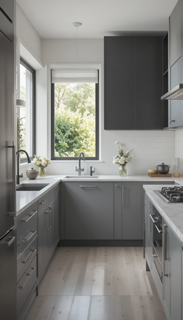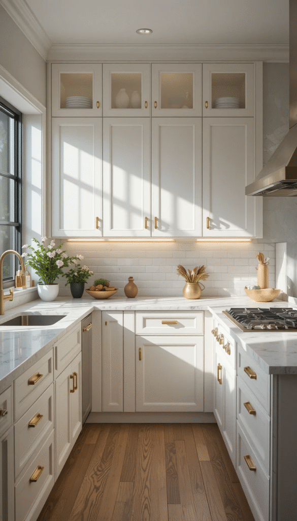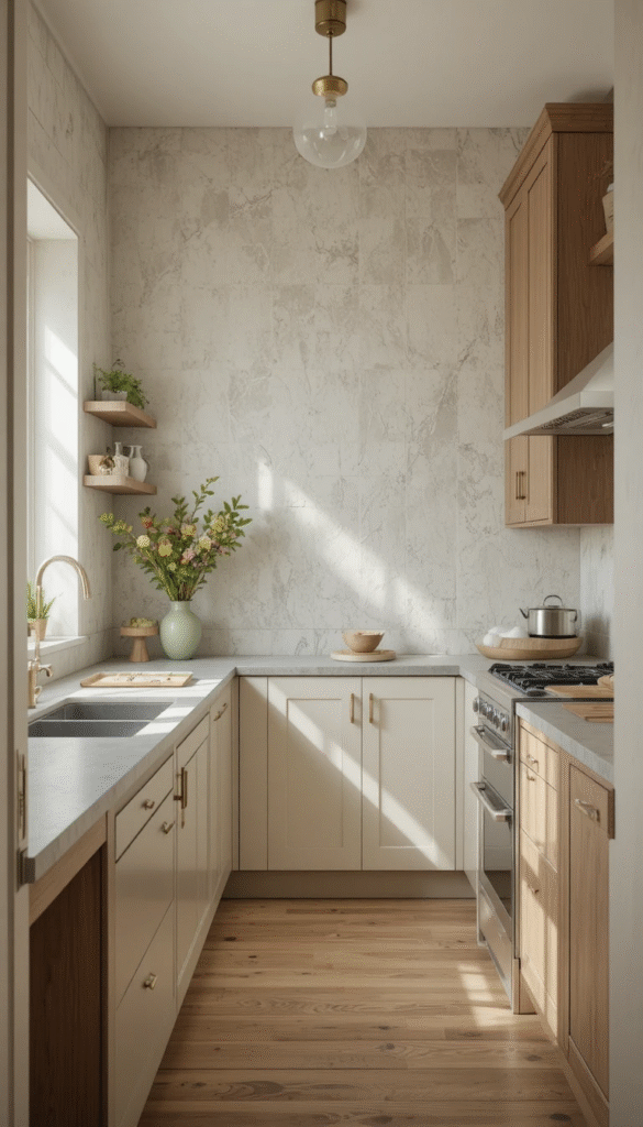 These tones work beautifully with wood accents and brushed brass hardware, making small kitchens feel timeless yet fresh.