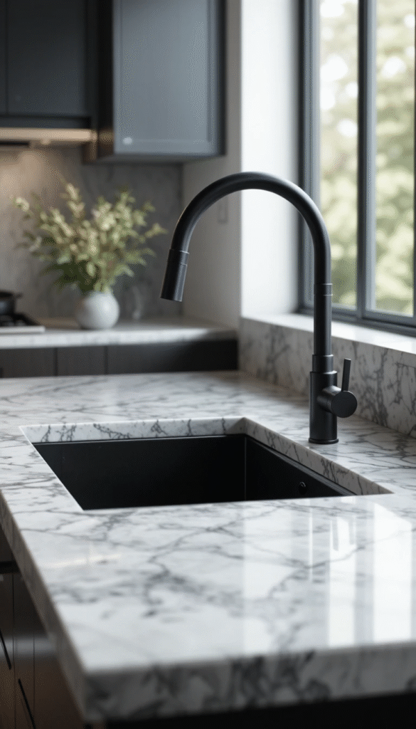 Pairing dark countertops with light cabinets creates dramatic contrast without shrinking the space visually.