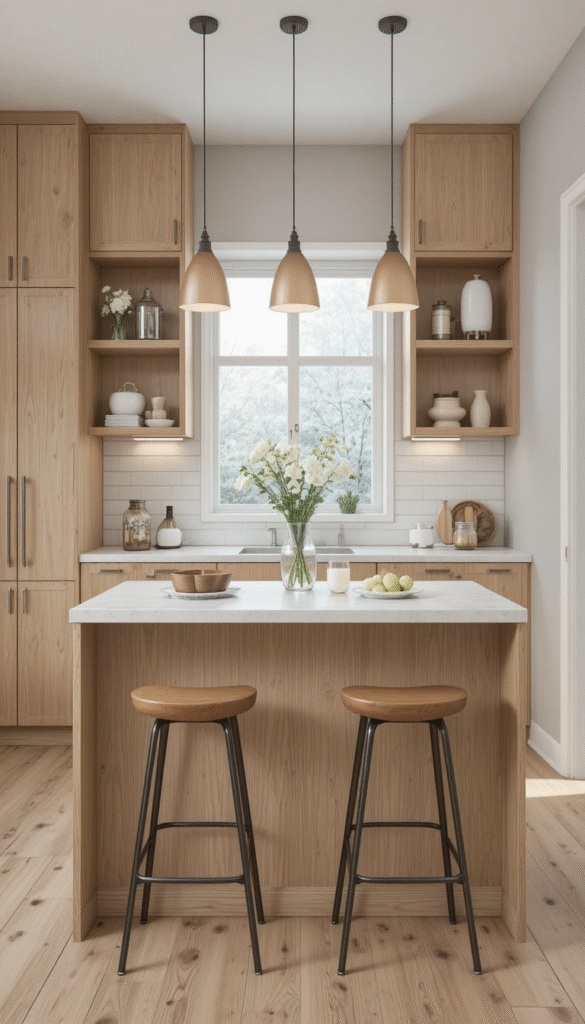 Wood tones are making a strong comeback in 2026. Light oak shelves, walnut islands, and butcher block accents add warmth to compact kitchens.