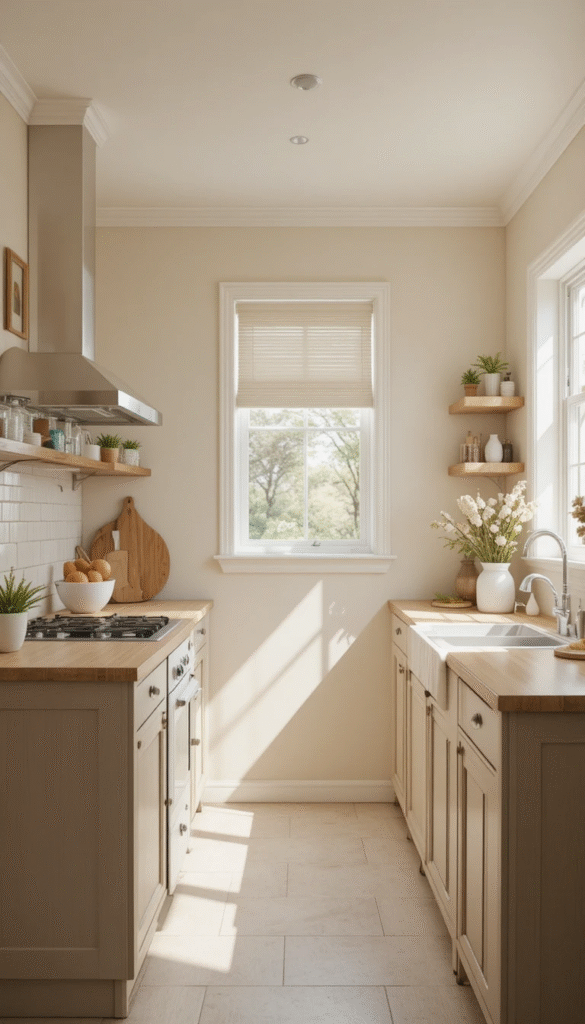 Cool grays are being replaced with warm neutrals in Small Kitchen Remodel 2026 designs. Soft beige, creamy white, and earthy taupe create a cozy and inviting atmosphere.