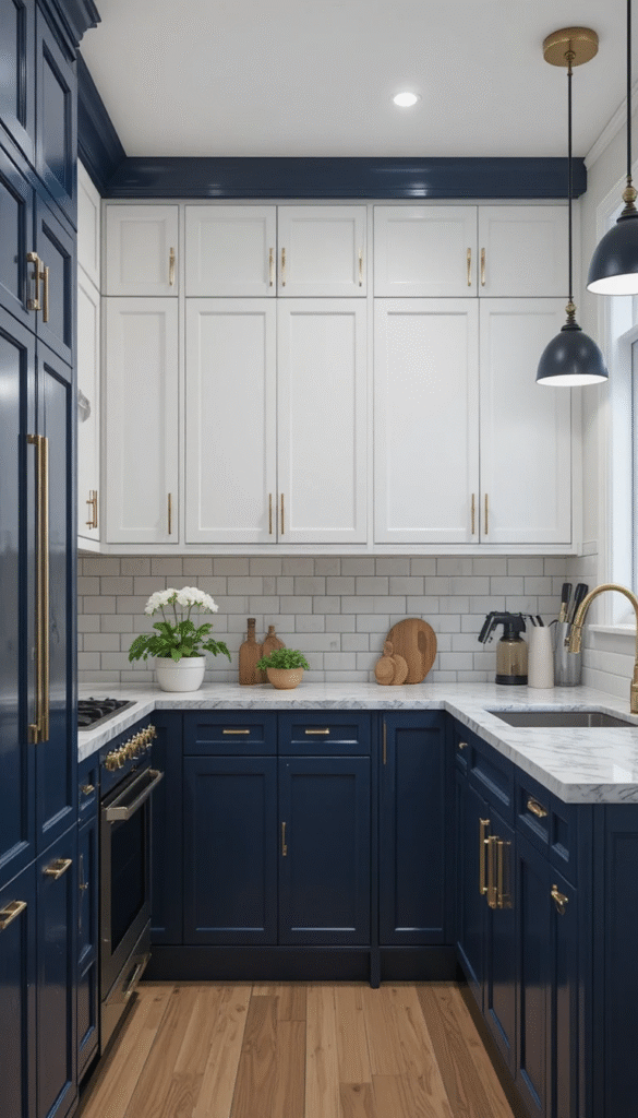 Two-tone cabinetry adds depth and dimension to compact kitchens. For example, upper cabinets in white combined with lower cabinets in navy or forest green create visual contrast.