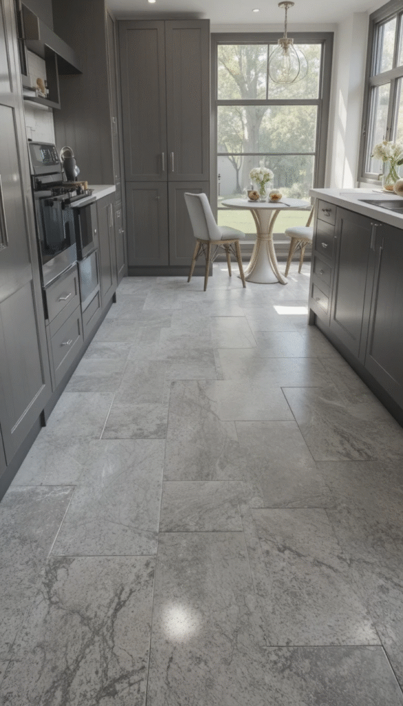 Larger tiles are surprisingly effective in small kitchens. Fewer grout lines make the floor look less busy and more expansive.
