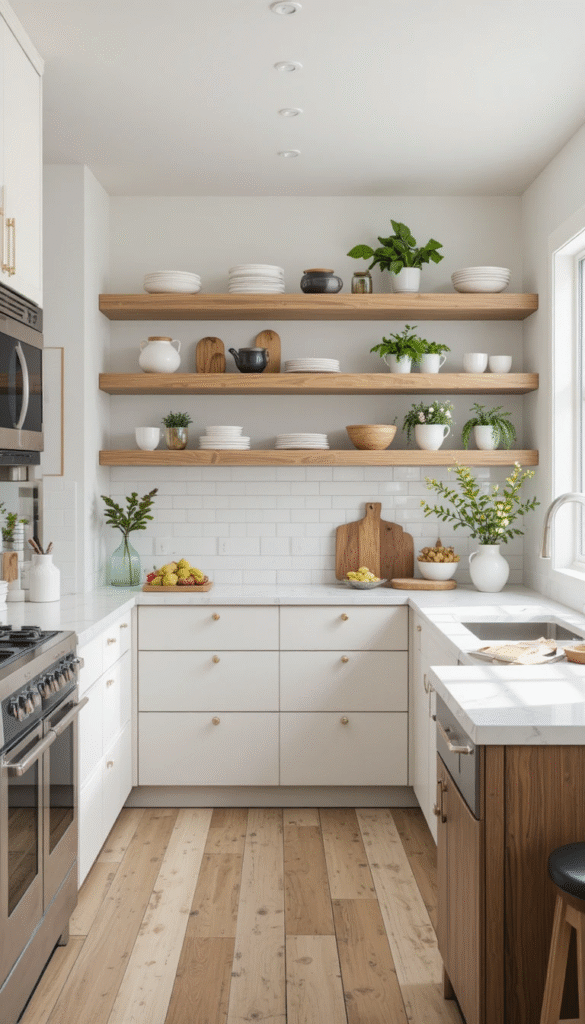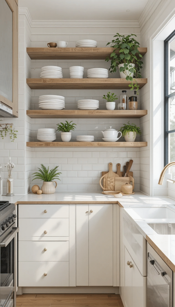 Displaying curated dishware, glass jars, or small plants adds personality without creating clutter.