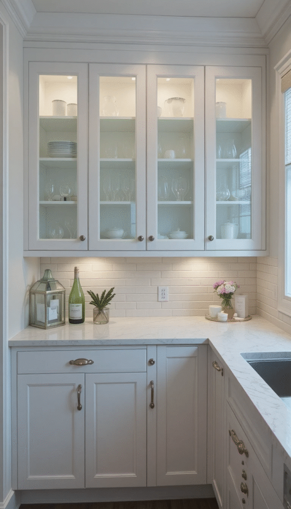 Glass-front cabinets help reflect light and make the kitchen feel more open. Frosted or fluted glass adds texture while maintaining a clean look.