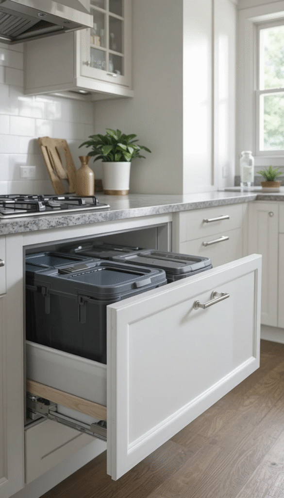 Hidden waste management systems are essential in modern small kitchen design. Pull-out bins keep trash and recycling neatly concealed.