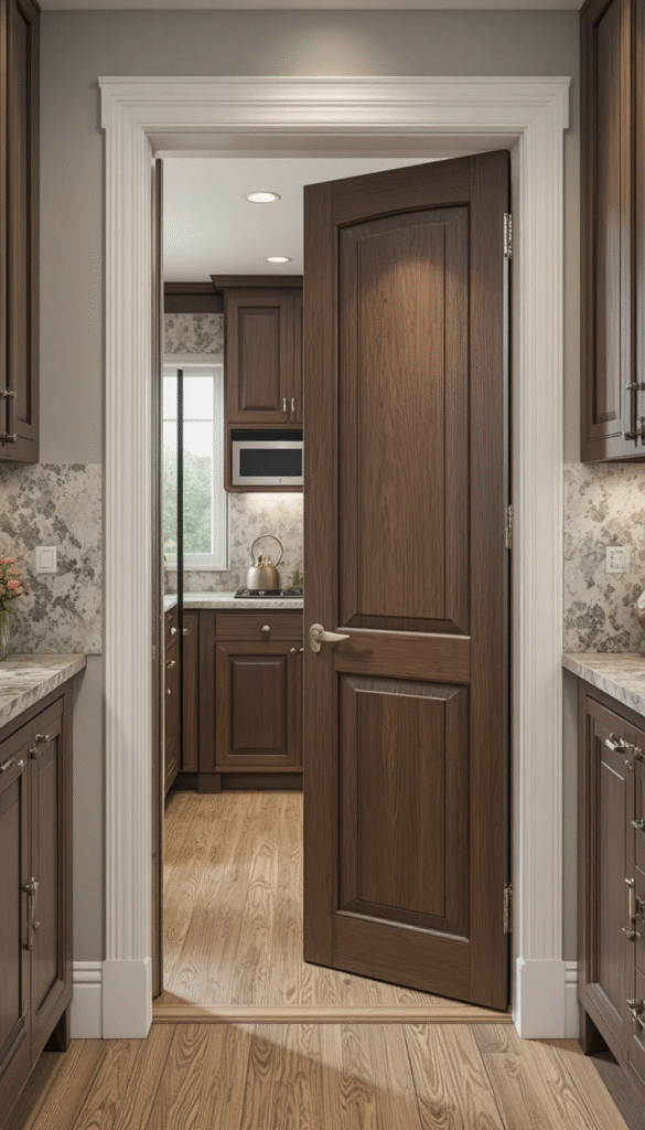 Pocket doors are ideal for tight kitchen layouts. They slide into the wall rather than swinging outward, saving valuable square footage.