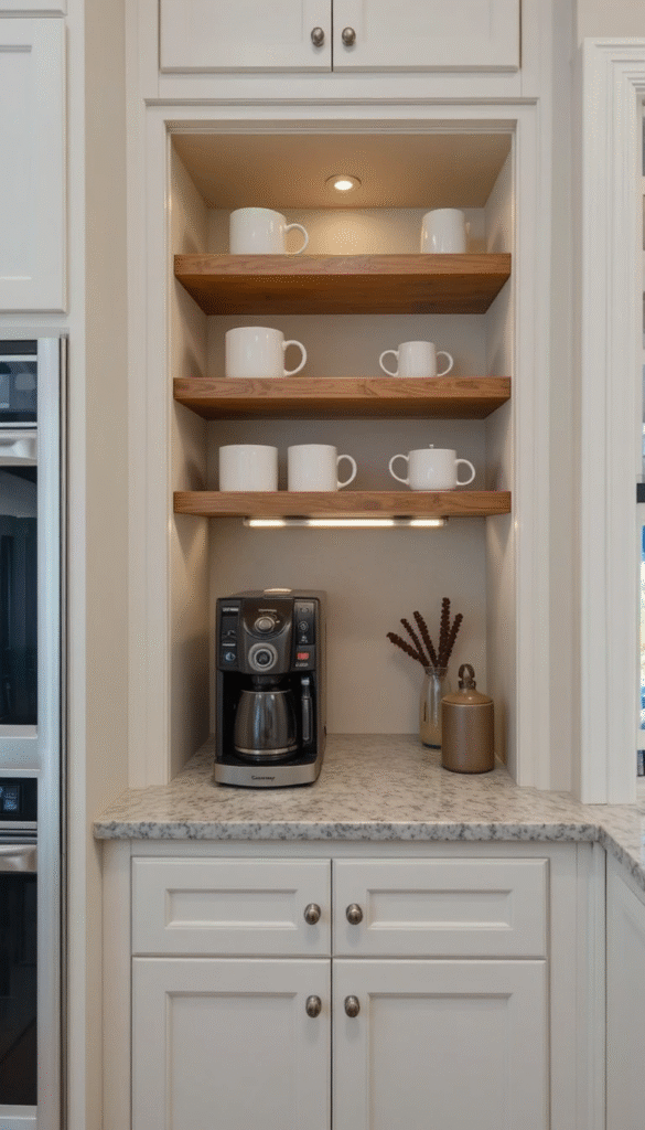 Dedicated coffee nooks are trending in American homes. A small built-in shelf or cabinet area for coffee machines keeps countertops clutter-free.