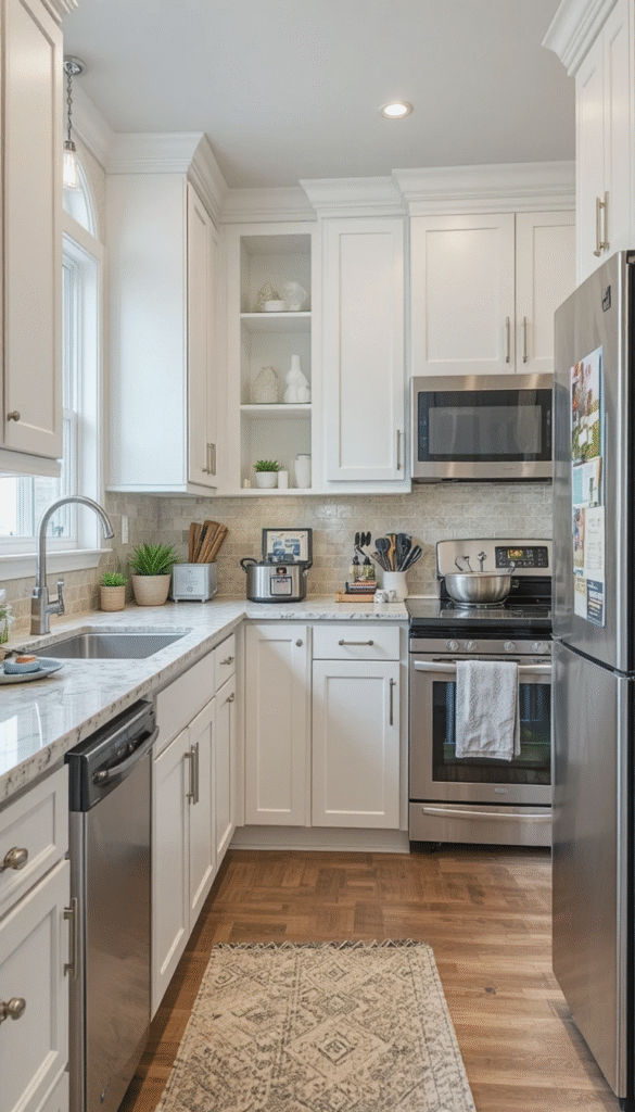 Cabinet design plays a major role in small kitchen aesthetics. Slim Shaker-style cabinets are trending in 2026 because they combine classic charm with a sleek, modern profile.