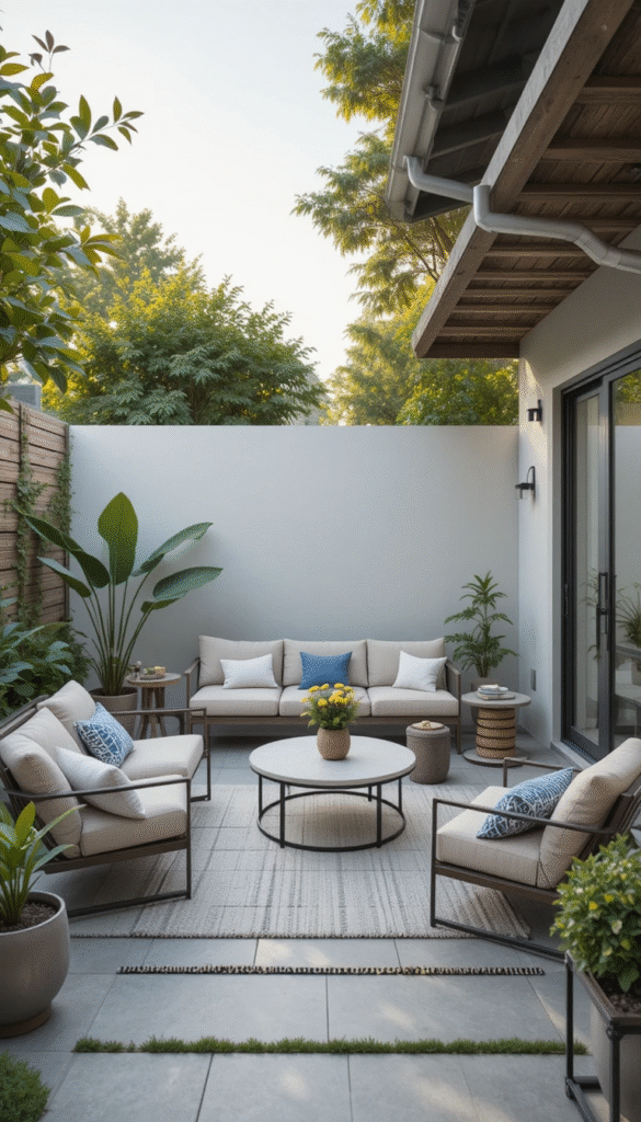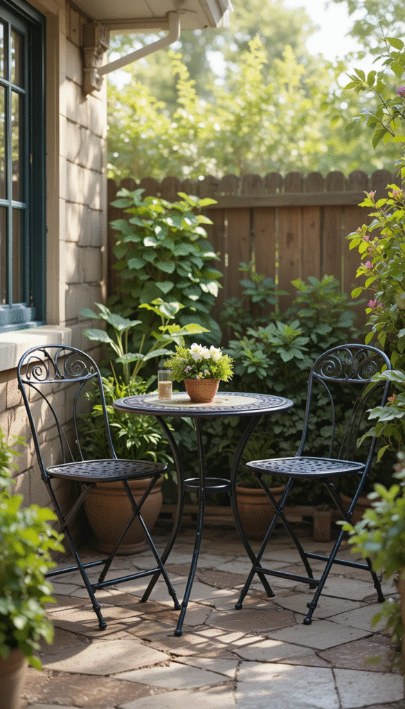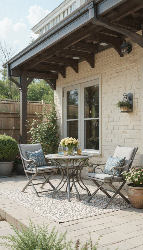 A bistro-style patio setup is perfect for small spaces. A compact round table paired with two stylish chairs instantly creates a charming spot for morning coffee or evening conversations. Choose foldable or stackable furniture to save space when needed. Adding a small planter or candle centerpiece makes the area feel warm and welcoming without overcrowding the patio.