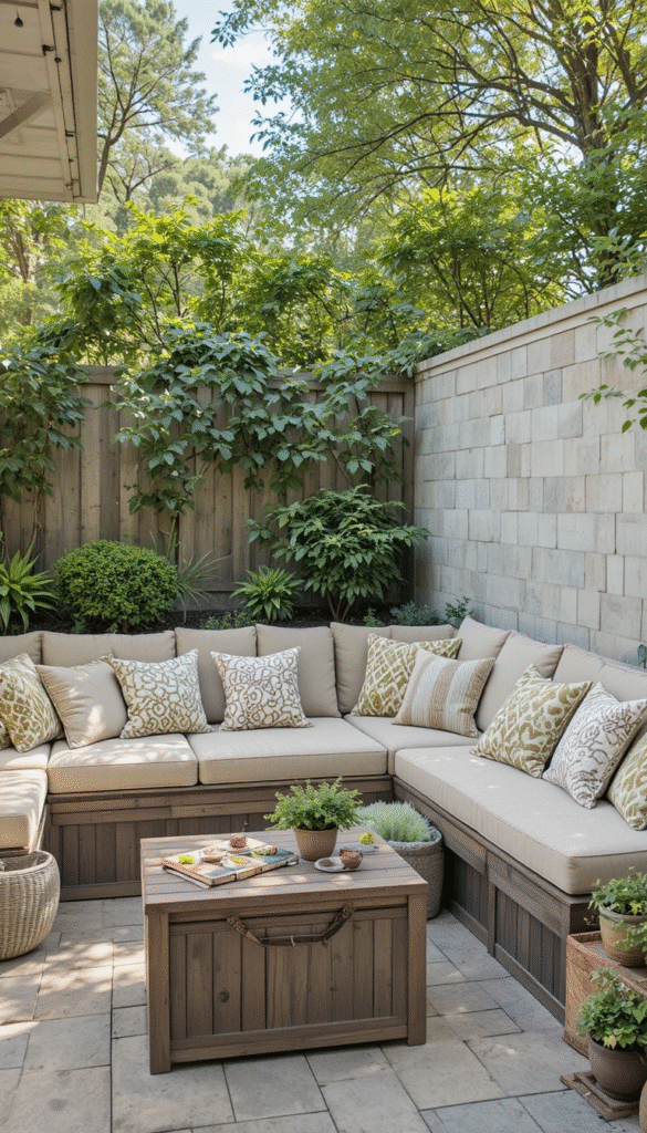 Built-in seating is a smart solution for maximizing small patios. A built-in bench along the patio wall provides comfortable seating while leaving more open floor space. Add weather-resistant cushions and patterned pillows to create a cozy look. Many benches can also include hidden storage compartments, making them perfect for storing outdoor accessories.