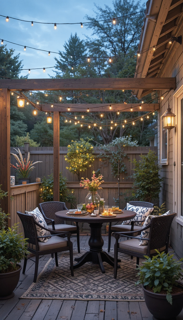 Lighting plays a huge role in patio design. Outdoor string lights instantly transform a small patio into a warm and inviting retreat. Hang them across railings, fences, or pergolas to create a soft ambient glow. This simple decor upgrade is affordable yet incredibly effective in creating a cozy evening atmosphere.