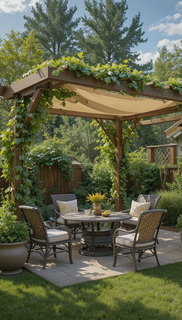 A compact pergola or shade sail can instantly upgrade the look of your patio while providing protection from the sun. Even a small pergola frame with climbing plants creates a cozy outdoor room feeling. This design idea adds height and structure, making the patio look larger and more stylish.
