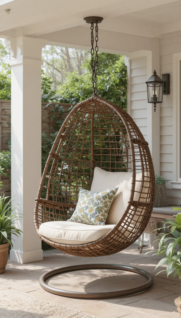 Hanging chairs are becoming extremely popular in 2026 patio design trends. A single hanging chair or swing chair adds both comfort and visual interest. It creates a relaxing lounge area while taking up less floor space compared to traditional furniture.