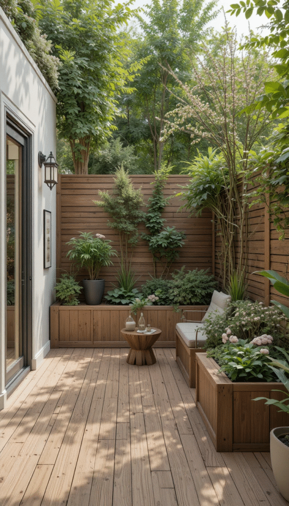 Natural materials are a major design trend in outdoor spaces. Using wooden furniture, decking, or planter boxes helps create a warm and organic atmosphere. Wood tones blend beautifully with greenery and give a small patio a calming, nature-inspired look.