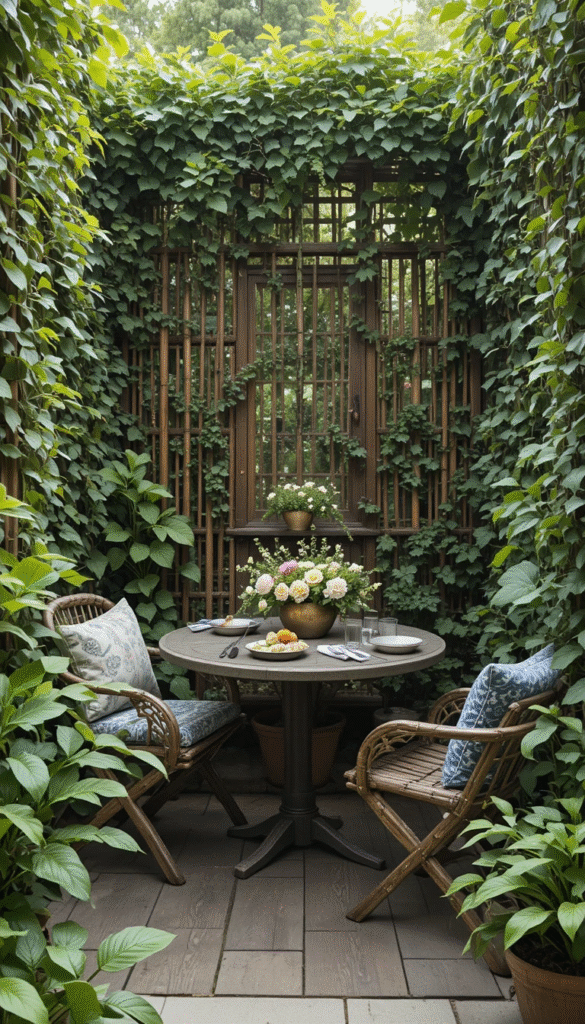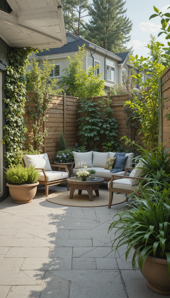 Privacy can be challenging in small outdoor spaces. Installing tall plants, bamboo screens, or lattice panels with climbing vines can help create a secluded retreat. This design idea adds greenery while making the patio feel more intimate and comfortable.