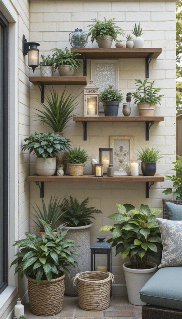 Wall-mounted shelves are a great way to display plants, lanterns, candles, and decorative accents without taking up floor space. This design trick keeps the patio organized while adding vertical interest to the overall layout.