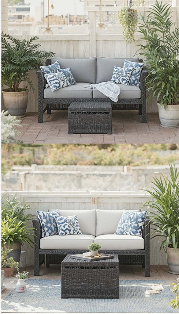 A small two-seat outdoor sofa or loveseat can turn a tiny patio into a relaxing lounge area. Pair it with a small coffee table or ottoman to create a comfortable seating arrangement perfect for reading or enjoying fresh air.