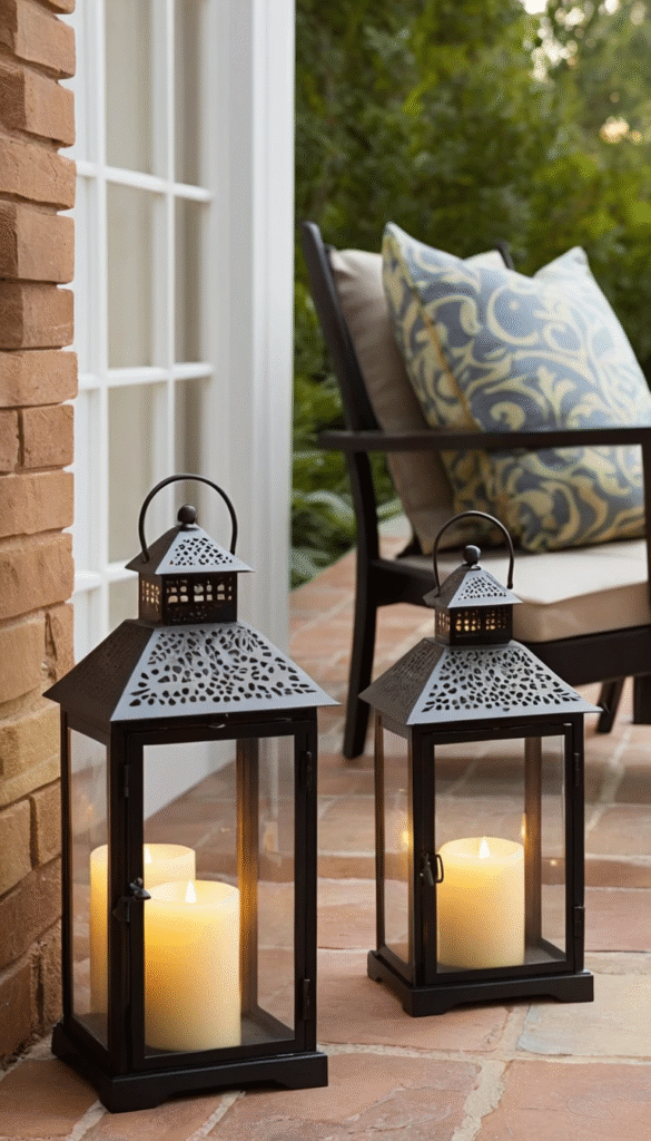 Lanterns add charm and warmth to any patio design. Placing decorative lanterns on tables, shelves, or the floor creates a cozy evening ambiance. Battery-operated LED candles inside lanterns provide safe and beautiful lighting.