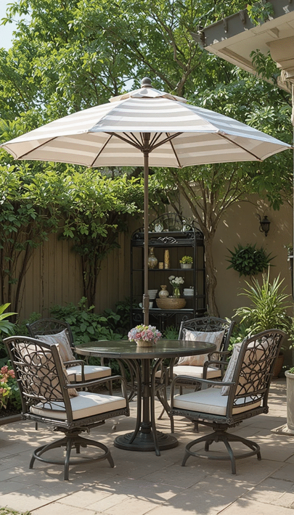 A compact patio umbrella provides shade during sunny afternoons and makes the space more comfortable to use throughout the day. Choose a neutral or striped umbrella to complement the overall design style.
