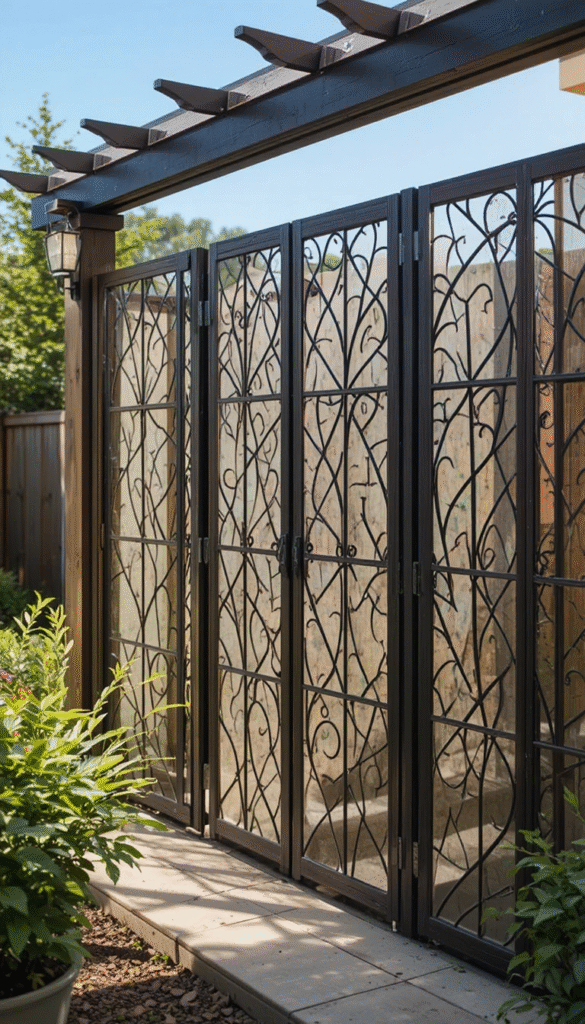 Decorative metal or wooden screens can add artistic flair while providing privacy. These decorative patio panels also create interesting shadows and patterns that enhance the visual appeal of the space.