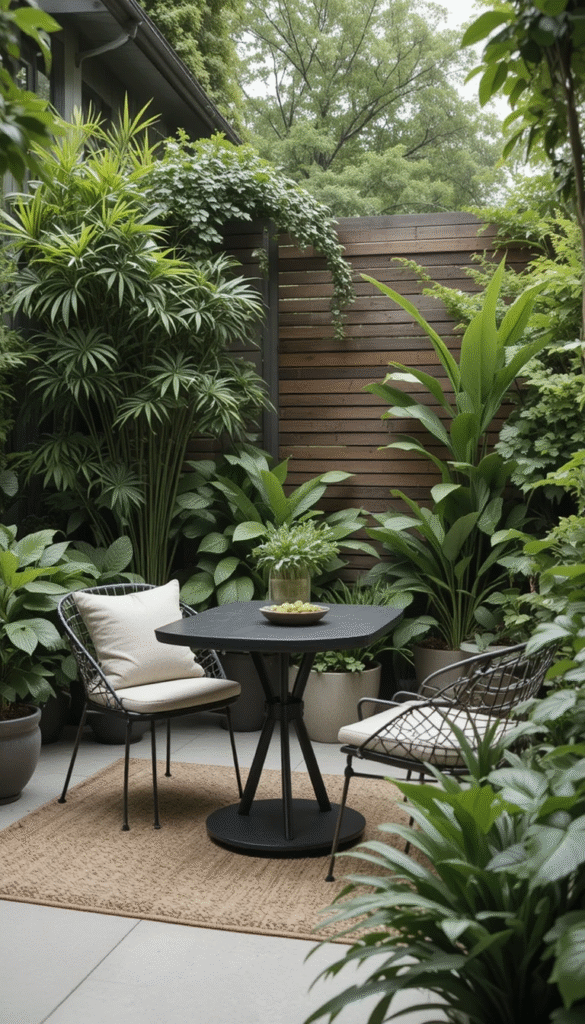 One of the most popular small patio design ideas for 2026 is blending lush greenery with modern furniture. Pair sleek metal chairs or minimalist tables with plenty of plants and natural textures. This contrast creates a stylish patio that feels both contemporary and relaxing.