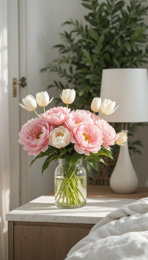 Nothing says spring like fresh blooms. Place a vase of tulips, peonies, or daffodils on your nightstand or dresser to instantly brighten the room and add a natural fragrance. If you prefer something that lasts longer, potted plants like peace lilies, lavender, or snake plants are excellent choices. Plants not only look beautiful but also improve air quality, making your bedroom a healthier place to relax and sleep.