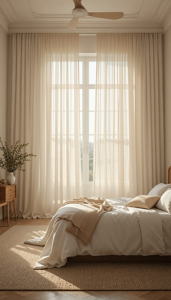 Heavy drapes might feel cozy in winter, but spring calls for something lighter. Replace thick curtains with sheer white or soft-colored panels that let natural light pour into the room. Linen and cotton sheers are especially popular choices because they move gently in the breeze and create a dreamy, romantic atmosphere. This simple change can completely transform how your bedroom looks and feels during the brighter spring months.
