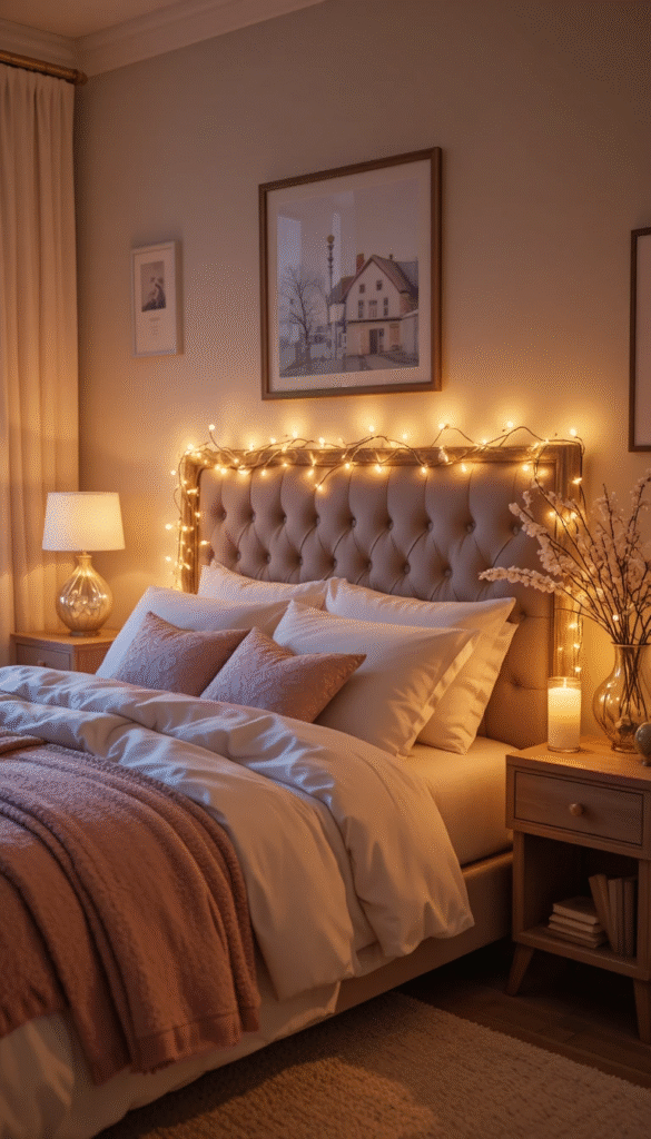 Swap out harsh overhead lighting for layered, soft lighting that creates a warm and inviting spring atmosphere. Use a combination of bedside lamps, string lights, and candles to build a cozy glow throughout the room. Warm-white LED bulbs mimic the soft light of spring evenings and are much more flattering than cool-toned bulbs. String lights draped above the headboard or along a shelf add a whimsical, magical touch that feels perfect for the season.