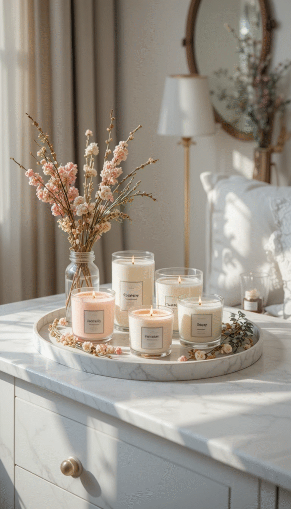 Group a small collection of spring-scented candles on a decorative tray on your dresser or windowsill. Look for scents like fresh linen, white tea, cherry blossom, or garden herbs that evoke the clean freshness of spring. Candles also add a beautiful visual element — choose ones in pretty pastel containers or clear glass jars to keep the look light and elegant. Lighting a candle each evening as part of your wind-down routine creates a lovely sensory ritual that helps you relax.
