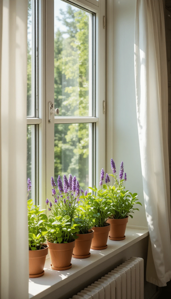 A windowsill herb garden is a uniquely charming spring bedroom idea that combines beauty with functionality. Plant small pots of lavender, mint, basil, or rosemary on your windowsill to fill the room with subtle natural fragrance while adding lush greenery. These plants thrive in the bright spring light that streams through bedroom windows. Choose matching terracotta pots or white ceramic planters for a clean, intentional look that doubles as a décor feature.