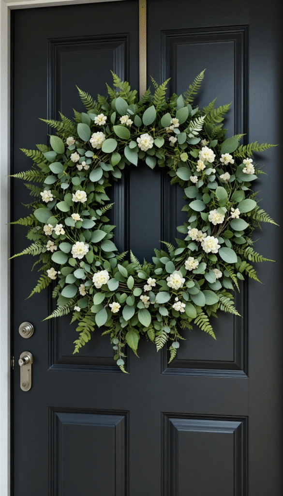 If you prefer a more natural and minimalist approach, a greenery and eucalyptus wreath is a stunning choice that works beautifully for Easter 2026. Using fresh or faux eucalyptus, ferns, lambs ear, and other lush green foliage, you can create a wreath that feels organic and effortlessly elegant. A few small white or cream-colored flowers tucked in among the greenery give it that gentle Easter touch without overwhelming the natural look. This style has become especially popular among homeowners who love Scandinavian-inspired or modern organic design trends, which focus on simplicity, texture, and a connection to the natural world.