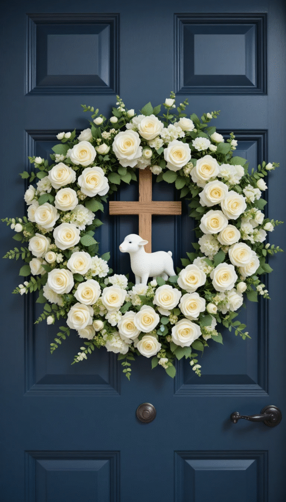 For families who want to keep the religious meaning of Easter at the center of their holiday décor, a lamb and cross wreath is a deeply symbolic and beautiful choice. You can build this wreath on a wooden cross form wrapped in white florals and greenery, or use a traditional circular base and attach a decorative lamb figurine and a small wooden or metallic cross as focal points. White flowers like roses, hydrangeas, and lilies are natural choices to surround these symbols, representing purity and resurrection in a visual and meaningful way. This wreath sends a clear and heartfelt message to anyone who visits your home about the true reason for the Easter season and reflects deeply held faith in a warm and welcoming way.