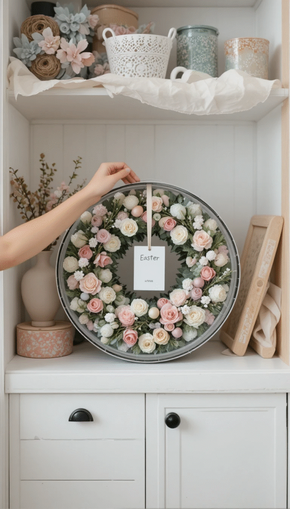 Personalization is one of the biggest home décor trends of 2026, and a monogrammed Easter wreath is a wonderful way to make your holiday display feel uniquely yours. You can start with a letter form from a craft store, cover it in moss, flowers, ribbon, or faux grass, and then display it proudly on your door as both a wreath and a personal statement. Families often use their last initial or the first letter of a family member’s name, turning the wreath into a meaningful keepsake that can be stored and reused year after year. This idea also makes an excellent handmade Easter gift for friends, neighbors, or family members who love seasonal home décor.