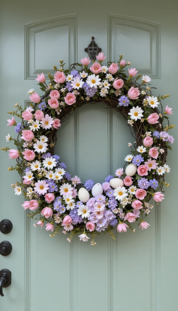 2. Hang a Wreath Filled with Faux Spring Flowers and Easter Eggs