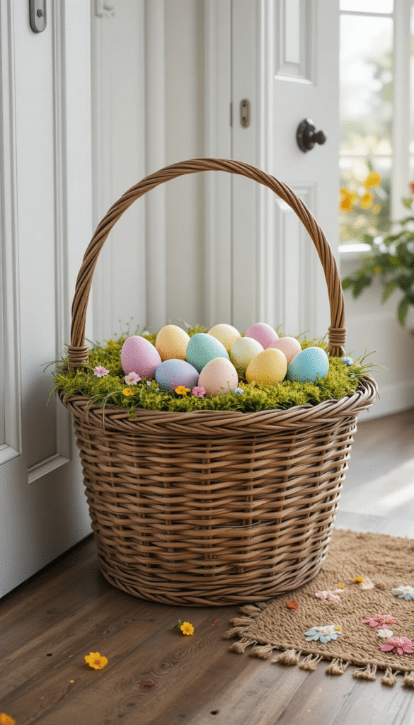 Place a large decorative basket filled with colorful Easter eggs near your front door to create a fun and festive focal point. You can use plastic eggs filled with candy or simply display hollow wooden or ceramic eggs in pastel shades. Add a little moss, faux grass, or shredded paper to the basket to make the eggs pop. This display is especially great if you have kids in the neighborhood and want to set a playful, family-friendly mood on your porch.