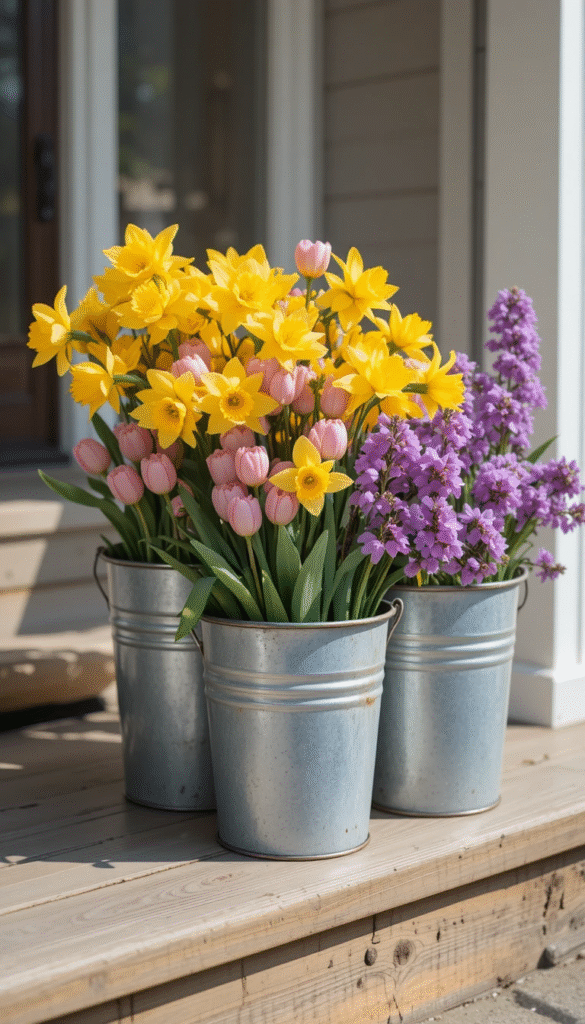 4. Use Galvanized Buckets to Display Fresh Spring Flowers