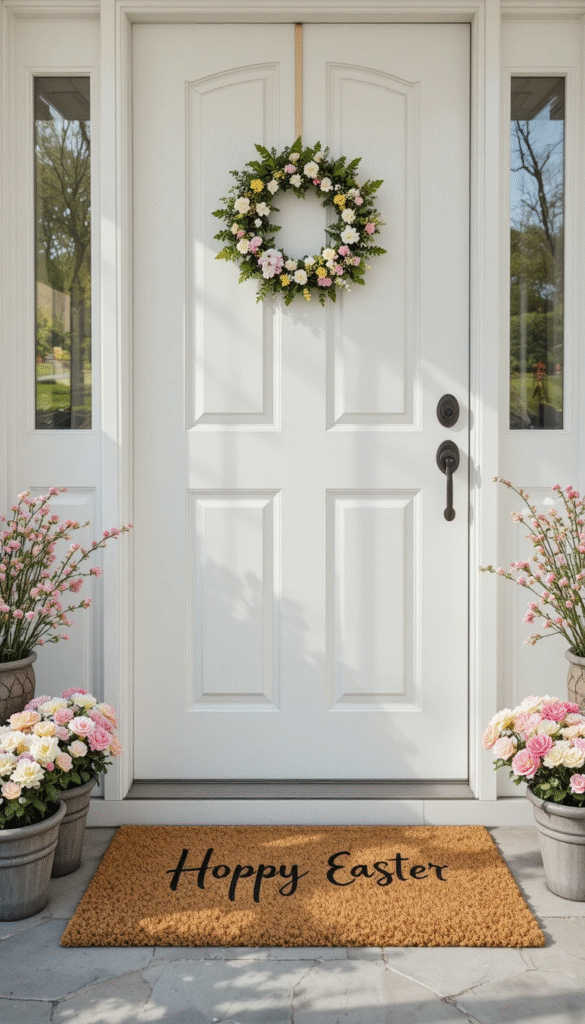 A custom Easter doormat with a fun message like “Hoppy Easter,” “Welcome, Spring,” or “Egg-cited to See You” is a small detail that makes a big impression. Look for doormats in natural coir, rubber, or outdoor-safe fabric in seasonal designs. This simple swap instantly updates the look of your entrance and doubles as a practical item that keeps dirt out of your home. Many online retailers now offer personalized doormats you can customize with your family name for an extra special touch.
