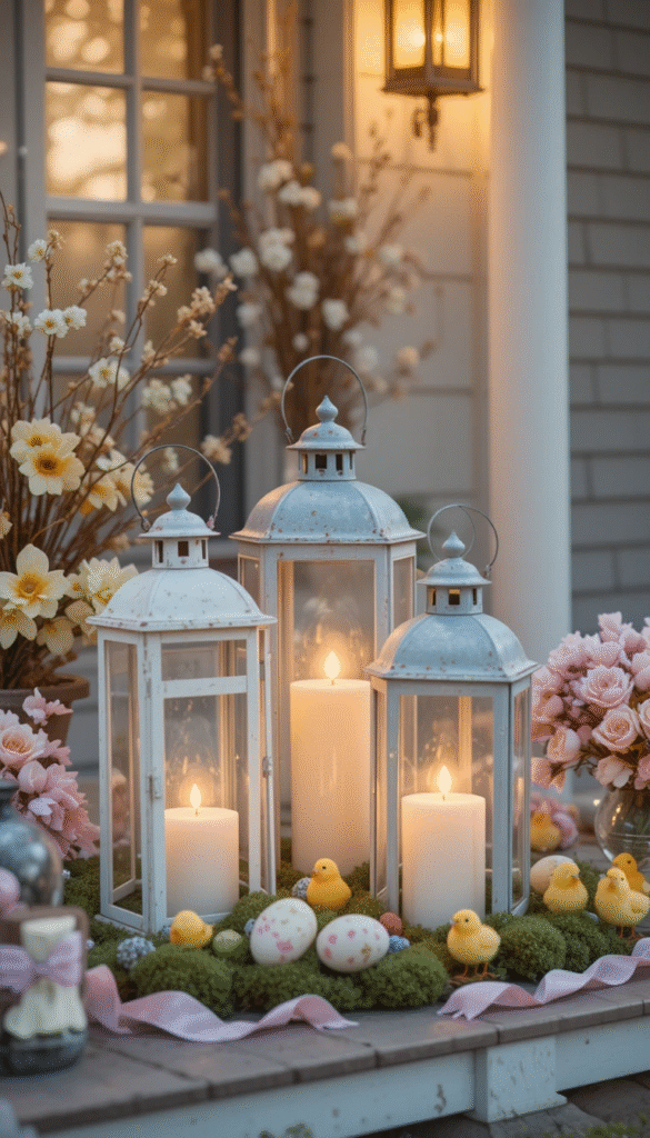 Group together two or three lanterns of different heights on your porch and fill them with battery-powered candles, Easter eggs, or small spring flowers. Lanterns bring a warm glow to your space, especially in the early evening when guests arrive for holiday gatherings. Choose lanterns in white, black, or galvanized metal to complement any porch style. You can tuck moss, faux chicks, or ribbon around the base of the lanterns to tie the Easter theme together beautifully.