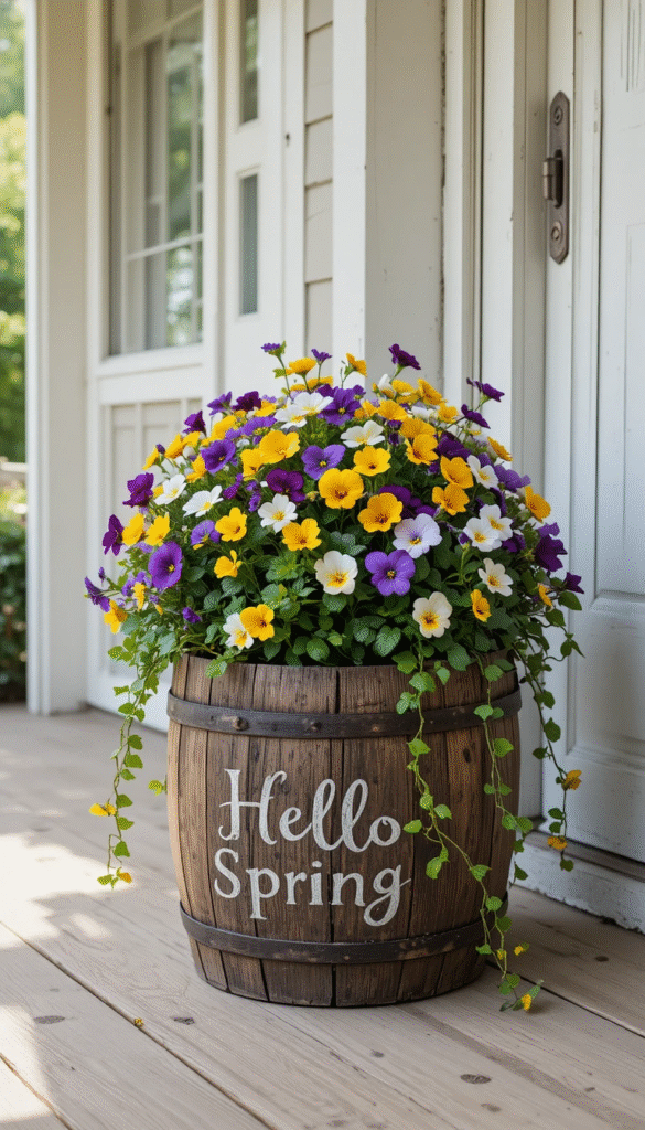 Repurpose an old wooden crate or barrel as a rustic Easter planter filled with bright spring blooms like pansies, primroses, or violas. This farmhouse-inspired idea adds texture and character to your porch while celebrating the season. Paint or stencil the crate with Easter-themed words like “Hello, Spring” or a simple bunny silhouette for a handcrafted touch. These planters are also incredibly versatile and can be moved around your porch to refresh the look whenever you feel like a change.