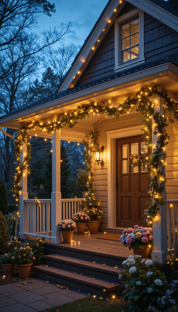 Warm white or pastel-colored fairy lights strung along your porch roofline or railing add a magical glow that makes your Easter porch look enchanting both day and night. Solar-powered options are ideal for spring since they charge during the longer daylight hours and come on automatically at dusk. Pair the lights with floral garlands or Easter egg garlands for a layered, festive effect. This is a decoration you can enjoy for the entire spring season, not just Easter weekend.