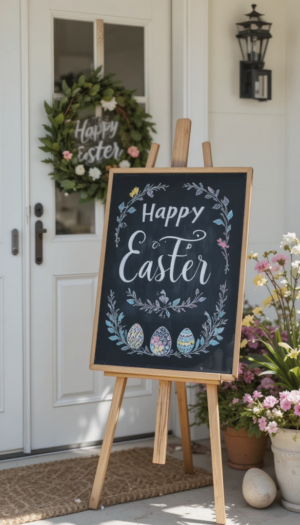 A chalkboard sign with a hand-lettered Easter greeting like “He is Risen,” “Happy Easter,” or “Spring Has Sprung” adds a personal, artsy element to your porch decor. Place it on an easel near your front door or prop it against a wall for a relaxed, casual look. You can change the message throughout the season to keep things fresh and relevant. Decorate the border of the chalkboard with chalk drawings of flowers, eggs, or bunnies for an extra creative touch.