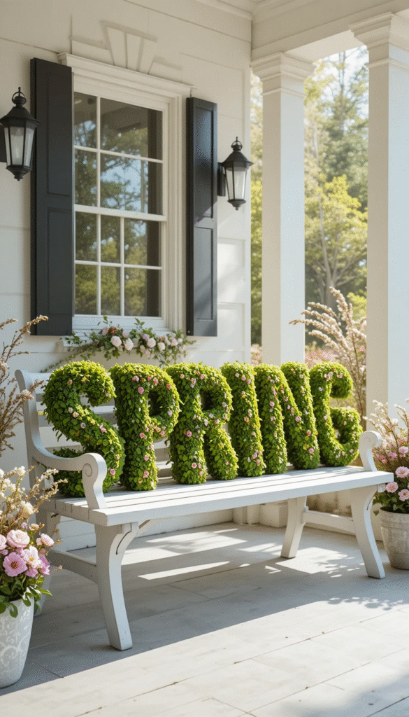 Moss-covered or floral letters spelling out “EASTER,” “SPRING,” or “HELLO” are a trendy and eye-catching porch decoration idea that photographs beautifully for social media. You can buy pre-made versions online or make your own using cardboard or foam letters covered in sheet moss, dried flowers, or faux greenery. Arrange them on a porch bench, shelf, or step riser for maximum visual impact. They add a natural, organic feel that perfectly captures the spirit of spring renewal.
