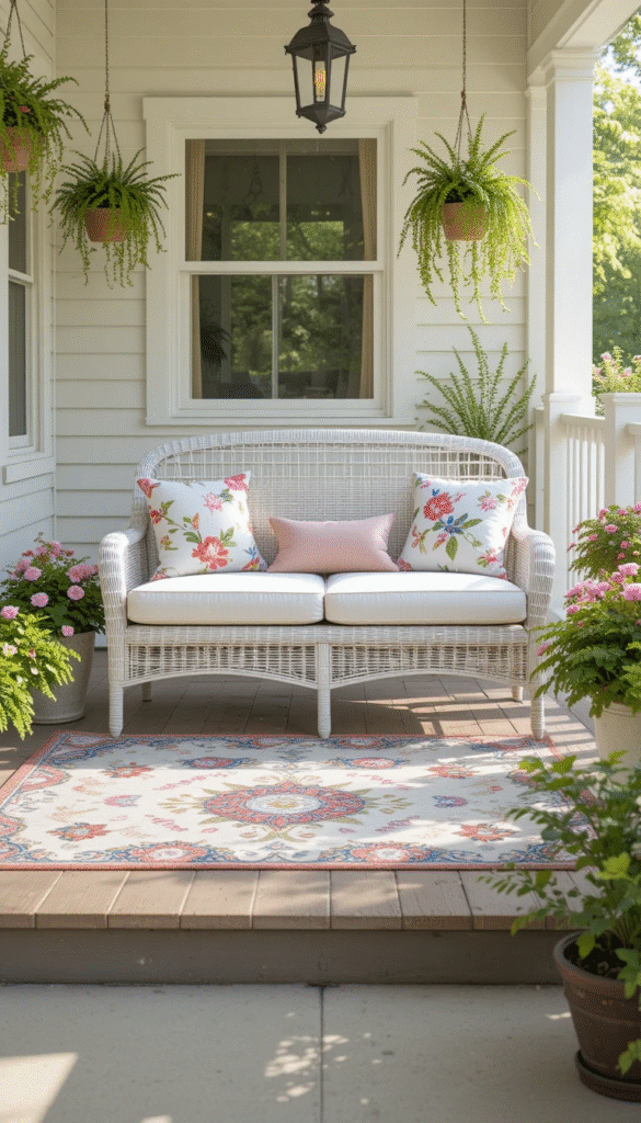 Swap out your standard outdoor rug for one featuring a floral, geometric, or Easter-inspired spring pattern in pastel or bright colors. An outdoor rug defines your seating area and instantly makes your porch feel more put-together and seasonally decorated. Look for weather-resistant, easy-to-clean options that can handle foot traffic and spring rain. A good rug pulls together all the other Easter elements on your porch and makes the entire space feel more intentional and polished.