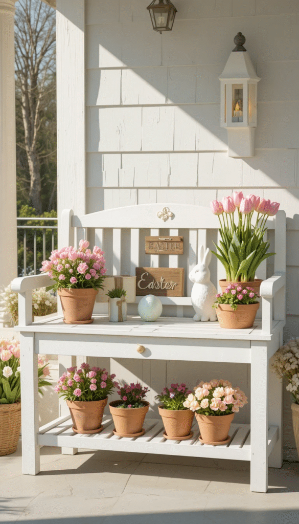 If you have a potting bench or small console table on your porch, transform it into an Easter vignette station filled with potted flowers, egg-shaped candles, a small bunny figurine, and a seasonal sign. Layer items at different heights using books, crates, or small pedestals for a curated, styled look. This kind of vignette is highly personalized and allows you to showcase your favorite Easter decorations in one beautiful, organized display. Change out elements each year to keep the look fresh and seasonally relevant.