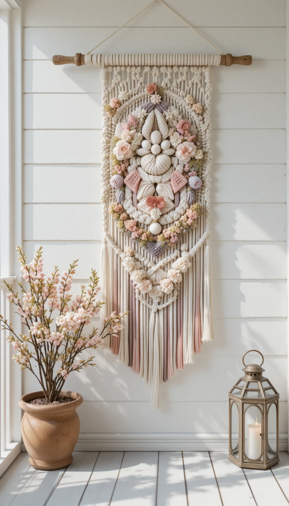 A handmade or store-bought macramé wall hanging woven with pastel threads and spring florals adds a boho, artsy dimension to your Easter porch decor. This type of wall art is incredibly on-trend for 2026 and adds texture and warmth that flat decorations cannot achieve. Look for designs that incorporate cotton fringe, wooden beads, dried flowers, or woven egg shapes. Hang it on a blank porch wall or from a beam for a statement piece that will have visitors asking where you found it.