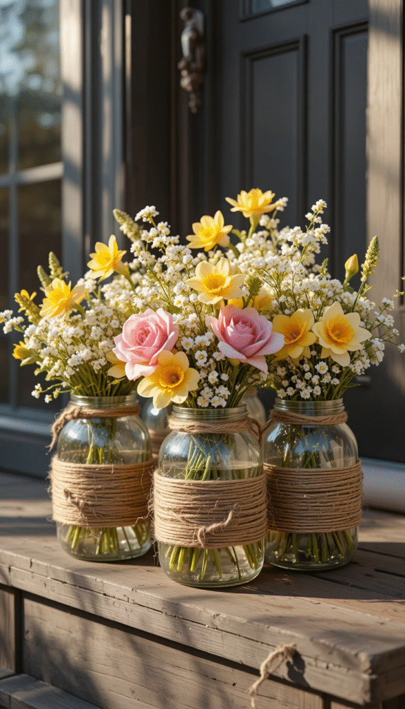 27. Use Mason Jars with Flowers and Twine as Porch Accents