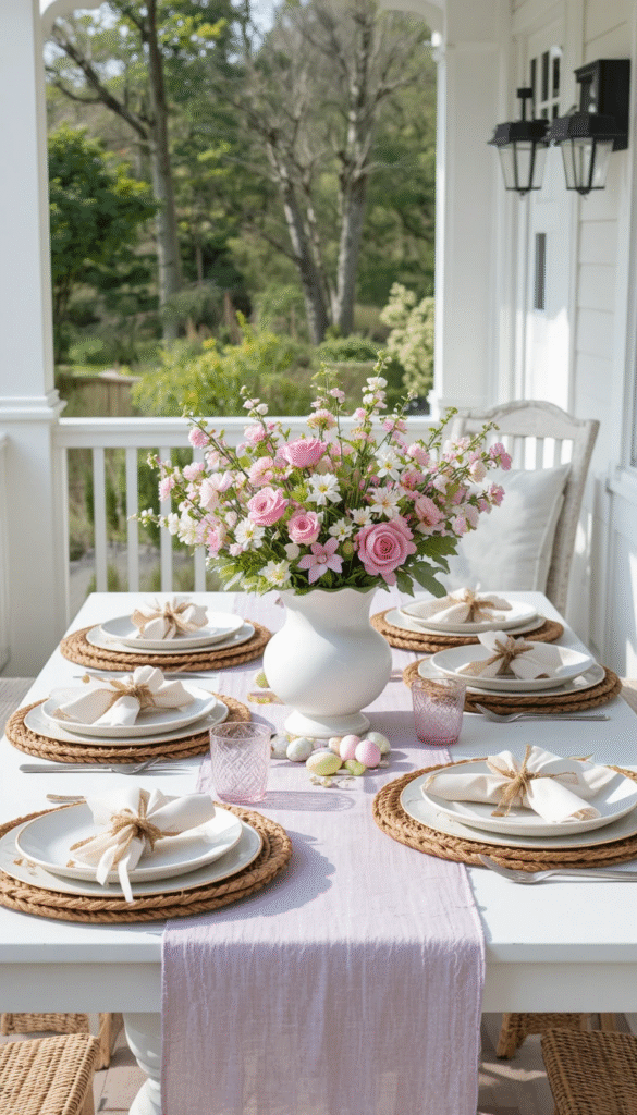 If your front porch has a table, dress it up with a full Easter-themed tablescape featuring a floral centerpiece, pastel table runner, Easter egg place cards, and seasonal napkins. This styled table setup transforms your porch into an outdoor entertaining space that is perfect for Easter brunch or afternoon gatherings. Use mismatched vintage plates and Easter-themed mugs for an eclectic, collected-over-time look. Even when guests are not visiting, a styled porch table signals that your home is a warm, welcoming place where celebrations are taken seriously and done beautifully.